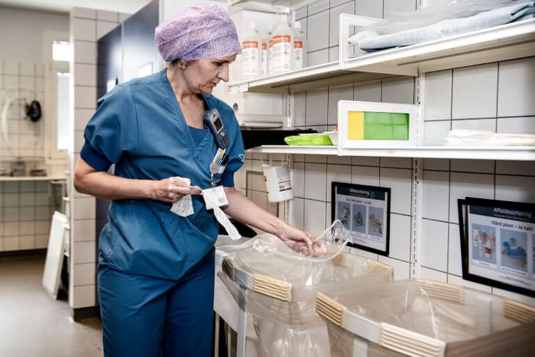 - Det handler rigtig meget om, at det skal være intuitivt. Det skal være let. Derfor har vi også sat de samme beholdere op rundt om på hospitalet, og vi skriver også meget tydeligt på væggen, hvilken type materiale der skal ned i de forskellige beholdere, siger Henrik Als, der er logistikchef på Herlev Hospital.