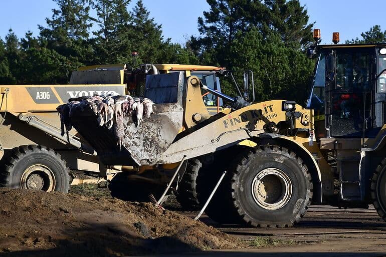 Også ved Holstebro nedgraves der aflivede mink på et areal tilhørende forsvaret. Proceduren begge steder er den samme: 25 centimeter kalk i bunden af gravene, et metertykt lag døde mink og til sidst kalk ovenpå, før der lægges jord på igen. Kalken skal inddæmme smitten.