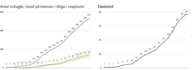 De seneste tal for afdøde gælder generelt en dag tidligere end tallene for indlagte. De nævnte fem døde således i løbet af søndagen, mens dagens tal for indlagte gælder mandag morgen.