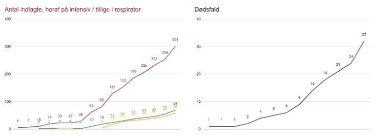 301 er indlagt mod 254 mandag, 69 er på intensiv, heraf 58 i respirator, mod henholdsvis 55 og 47 mandag. Antallet af dødsfald er nu oppe på 32 mod 24 dagen forinden - idet antallet af dødsfald opgøres med en dags forsinkelse i forhold til patienttallene.