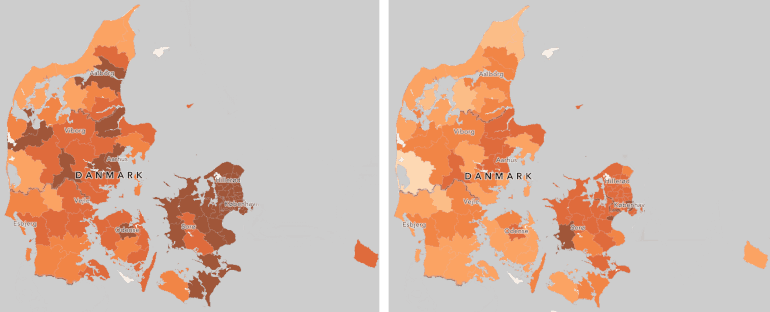 I den modsatte ende af skalaen har Herlev nu passeret en incidens på 700, og Solrød, Ishøj, København og Glostrup ligger alle over 600.