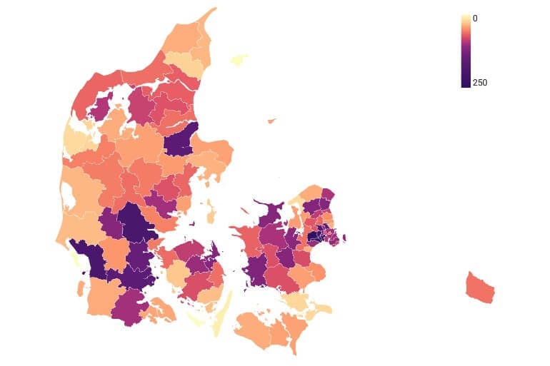 Bedst ser det ud i Aarhus, som med en incidens på 66,3 i dag placerer sig lige præcis midt i feltet af kommuner, nemlig med den 49. højeste incidens. Næsten lige så godt står det til i Aalborg med incidens på 70,2.