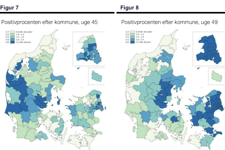 Fordelt på kommuner viser kortet øverst i artiklen, at positivprocenten er steget meget i hovedstadsområdet, mens man fx i Holstebro, hvor incidensen stadig er høj, har en lav positivprocent.