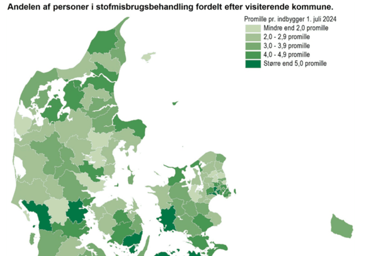 Se kommunefordelingen af borgere der i 2024 var i misbrugsbehandling på Danmarkskortet nedenunder: