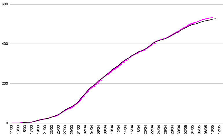 Derimod er der højst usædvanligt registreret færre dødsfald i dag end i går, 527 i alt mod 533 i alt. Det dækker over en registreringsfejl, afledt af at man i slutningen af marts skiftede kriterie for, hvornår et dødsfald er corona-relateret eller ej.