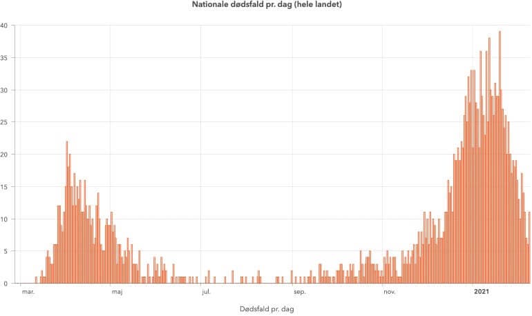 De 28 nu registrerede dødsfald fordeler sig med syv lørdag, seks søndag og 11 mandag og de resterende som korrektioner af tallene for forskellige dage bagud i tiden. Det, der er værd at lægge mærke til, er, at tallene overordnet viser en faldende tendens.