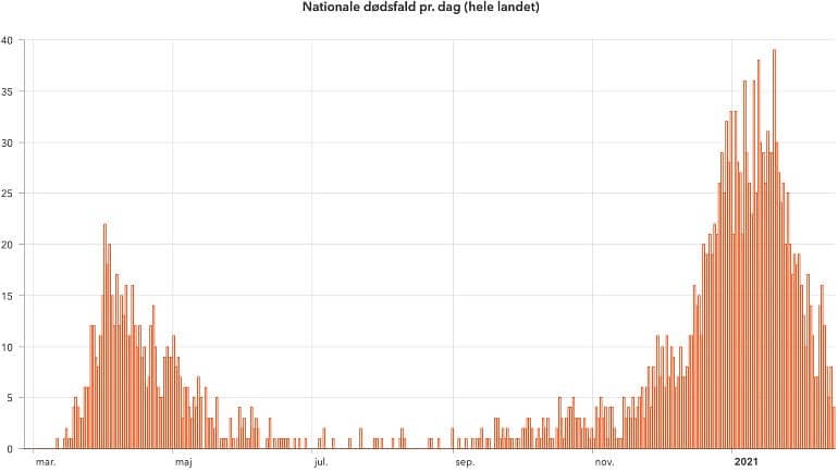 Efter at der for anden weekend i træk var driftsforstyrrelser i dødsårsagsregistret, viser de nyeste tal nu, at der hen over torsdag, fredag, lørdag og søndag indtraf henholdsvis otte, fem, otte og fire coronarelaterede dødsfald. Pr løbende uge er det 67 dødsfald de seneste syv dage mod 79 de foregående syv og 134 i løbet af de syv dage før da.