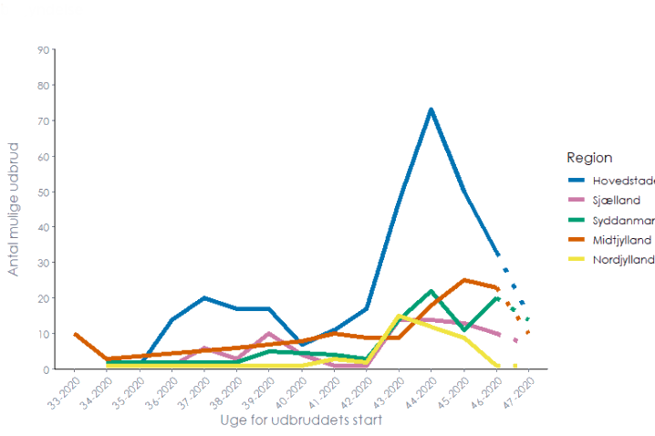 Tallene er en smule lavere end sidste uge, da 234 skoler havde igangværende mulige udbrud. Kurverne for de enkelte regioner, som ses øverst i artiklen, viser da også, at tallene er faldet de seneste uger. Især i Hovedstaden, hvor over 70 skoler var ramt sidst i oktober.