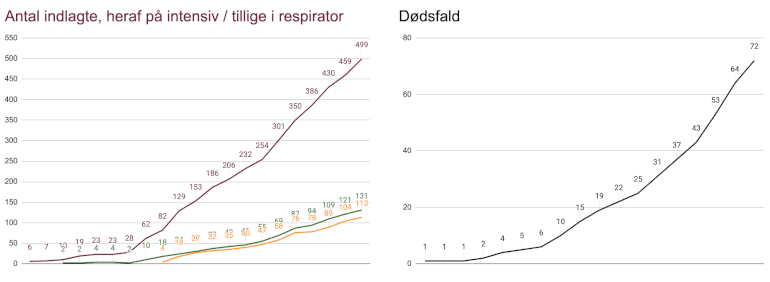 Dagens antal indlagte er 499, 40 flere end lørdag. Heraf ligger 131 på intensivafdeling mod 121 lørdag, og af dem er 113 i respirator mod 104 lørdag. Alle tal ligger midt i feltet af tidligere tal for et enkelt døgn.