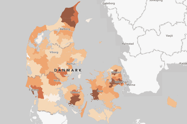 Kun ni kommuner har ikke haft nye smittede siden fredag, nemlig Halsnæs, Lolland, Ærø, Haderslev, Billund, Aabenraa, Samsø, Morsø og Læsø.
