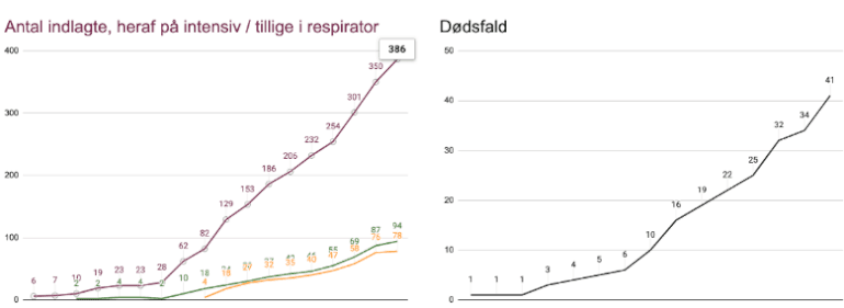 I alt er 386 indlagt torsdag, heraf 94 på intensiv, og af dem er 78 i respirator. Det er henholdsvis 36, 7 og 2 flere end onsdagens tal. De to foregående dage steg tallet med 47 fra mandag til tirsdag og 49 fra tirsdag til onsdag.