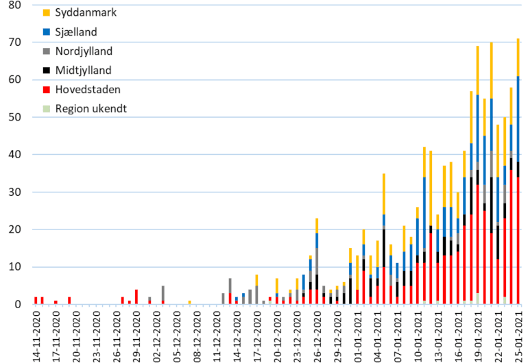 En oversigt over de smittede med B117 (graf øverst i artiklen) viser, at der er fundet flest i Region Hovedstaden.