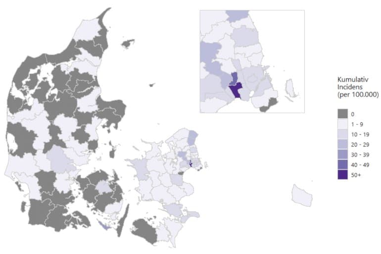 Brøndby og Glostrup er nu de eneste kommuner, som den seneste uge har haft over 40 nye coronasmittede pr. 100.000 indbyggere. Det viser mandagens oversigt fra Statens Serum Institut.