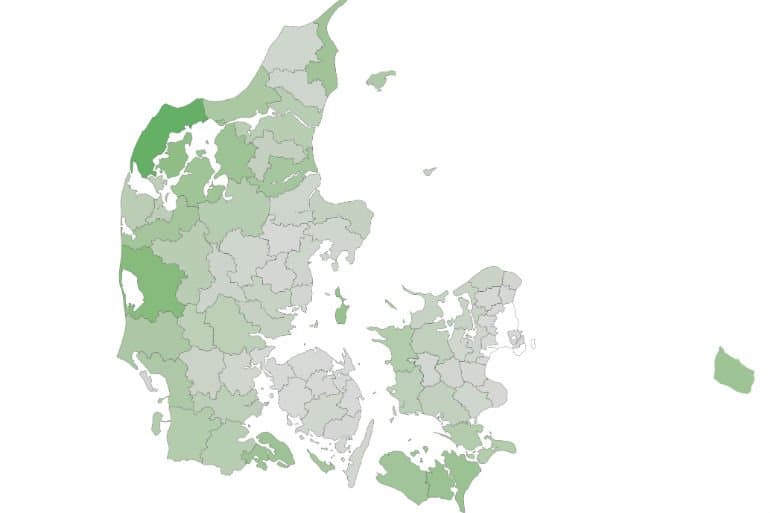 Som det ses på kortet øverst, gælder det især kommunerne i det vestlige, sydlige og nordøstlige Jylland samt de sydlige og vestlige kommuner i Region Sjælland. Herudover har der været en del flyvninger til Bornholm, Ærø, Samsø og Læsø.
