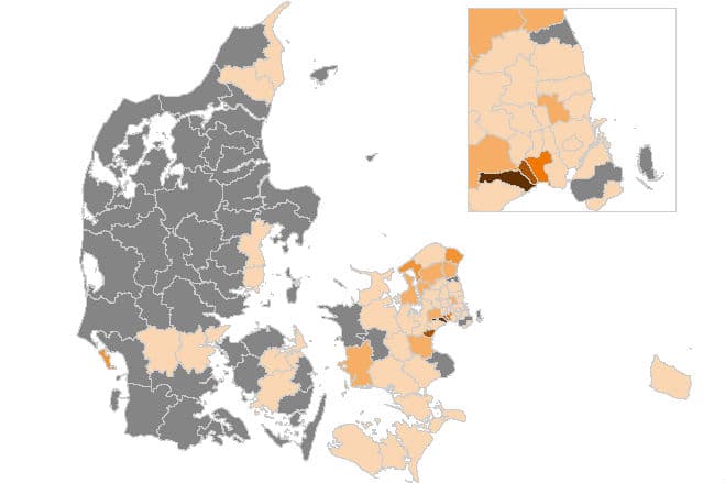 Til gengæld har kun fem af de 46 østdanske kommuner været uden nye covid-19-tilfælde den seneste uge. Værst i forhold til befolkningstallet ser det ud i Ishøj, Vallensbæk og Brøndby.